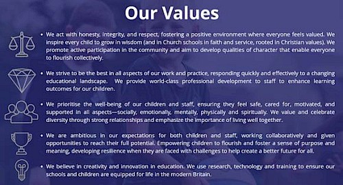As our school vision, this is at the heart of all that we do. Rooted in our Christian foundation, supported by our village community and guided by our core values of perseverance, responsibility, integrity, compassion, forgiveness and respect, we inspire children to be curious, communicate with confidence and develop the skills and character to succeed.